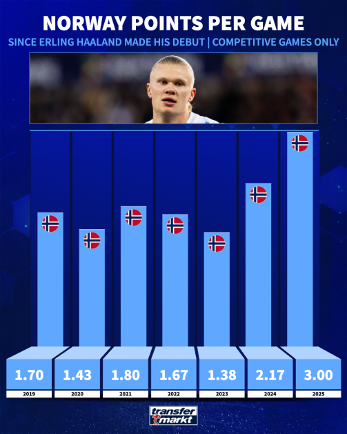 สถิติการทำเฉลี่ย 3.0 คะแนน-ต่อ-เกมของนอร์เวย์ในปี 2025 นั้นสูงกว่าสถิติใดๆ ที่ ฮาแลนด์ เคยเล่นให้ทีมชาติมาก่อนหน้านี้อย่างมาก