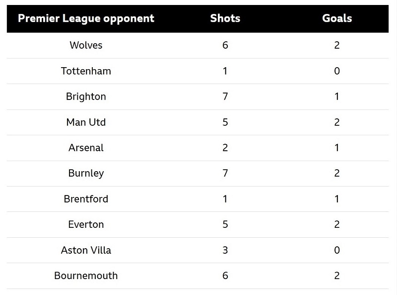 สถิติของ ฮาแลนด์ ในฤดูกาลนี้แตกต่างออกไป นักเตะคนอื่นเพียงรายเดียวที่ยิงได้ 13 ประตู จาก 10 เกมแรกของพรีเมียร์ลีก คือ เลส เฟอร์ดินานด์ สมัยอยู่กับ นิวคาสเซิ่ล ในฤดูกาล 1995-96 ขณะที่ตัวของ ฮาแลนด์ เองก็ทำไป 15 ลูก ในปี 2022