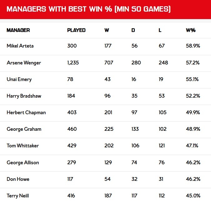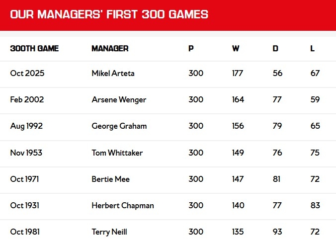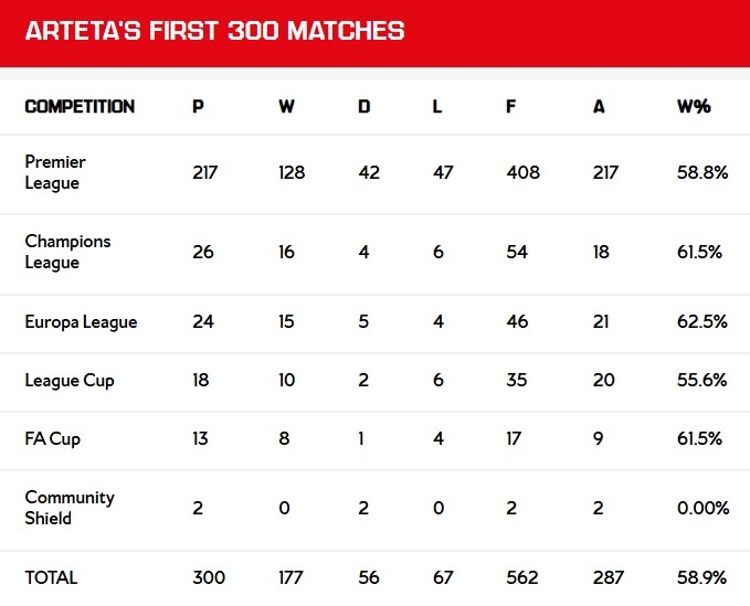 ไม่มีผู้จัดการทีม อาร์เซน่อล คนใดที่เก็บชัยชนะได้มากกว่า อาร์เตต้า เลยใน 300 นัดแรกของการคุมทีม โดย อาร์เตต้า พาทีมชนะได้ถึง 177 นัด