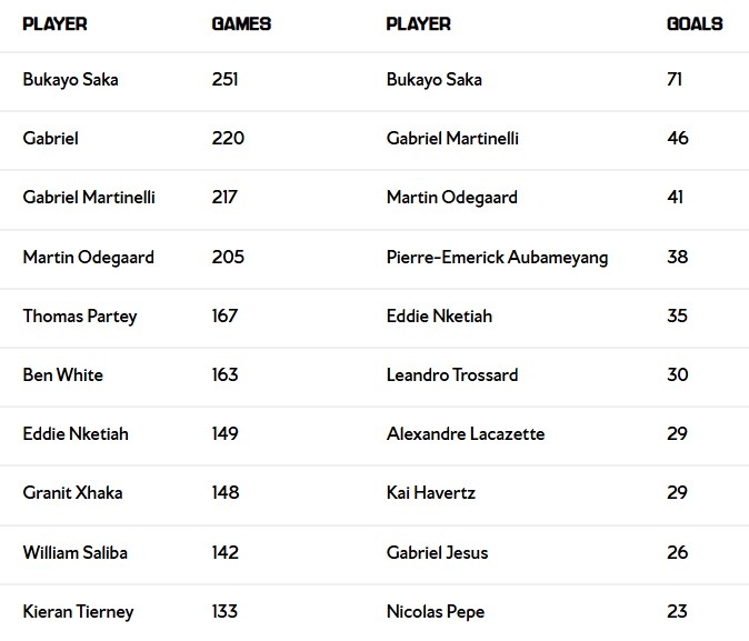 มีนักเตะเพียงหนึ่งคนเท่านั้นที่อยู่กับสโมสรมาตั้งแต่วันนั้นจนถึงวันนี้ ดังนั้นจึงไม่ใช่เรื่องน่าแปลกใจเลยที่ บูคาโย่ ซาก้า จะเป็นผู้นำแบบทิ้งห่างทั้งในแง่ของจำนวนเกมที่ลงเล่นและจำนวนประตูที่ทำได้ ภายใต้การคุมทีมของ มิเกล อาร์เตต้า