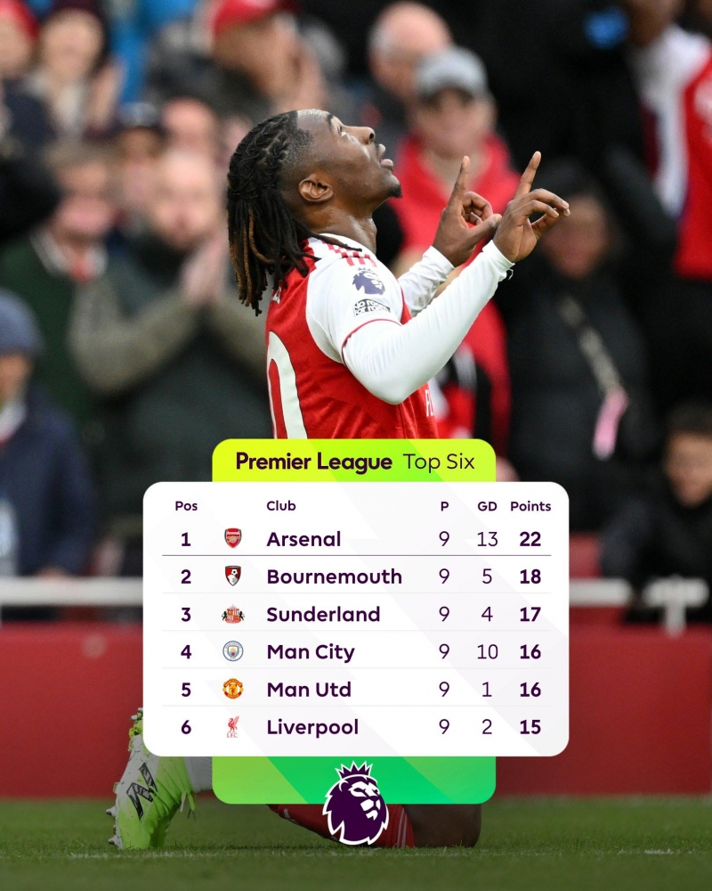 ในตารางคะแนนตอนนี้ อาร์เซน่อล อาจเซอร์ไพรส์นิดๆ ที่สองทีมตามหลังคือ "น้องใหม่" ซันเดอร์แลนด์ และบอร์นมัธ ส่วนช่องว่างกับ แมนฯ ซิตี้ เพิ่มเป็น 6 คะแนน และหนี ลิเวอร์พูล เป็น 7 คะแนน