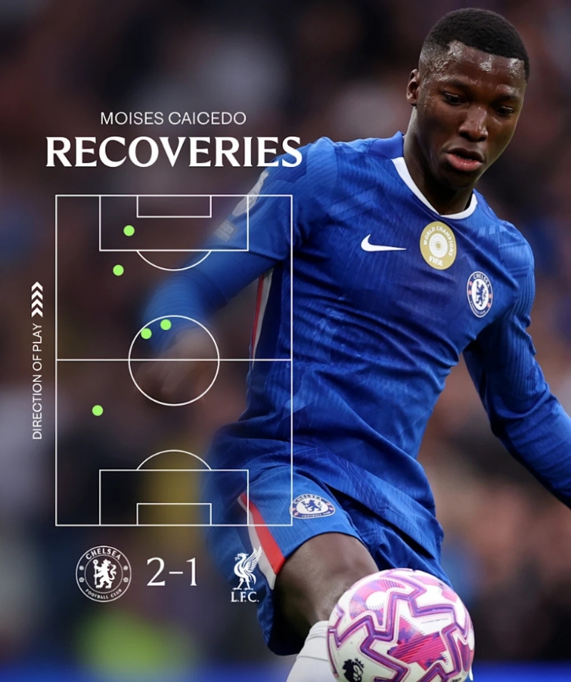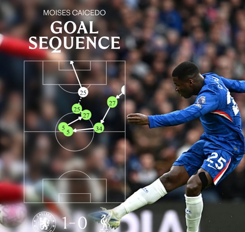 เมื่อมองจากจุดเริ่มต้นของประตูชัยที่ทีมทำได้ เราจะเห็นได้ว่าการผ่านบอลอันแม่นยำของ ไกเซโด้ ให้กับ โรเมโอ ลาเวีย นั้นช่วยให้ทีมหนรการเพรสซิ่งของ ลิเวอร์พูล และการเคลื่อนไปข้างหน้าอย่างรวดเร็วจาก เอ็นโซ่ เฟร์นานเดซ, มาร์ก กูกูเรย่า ปิดท้ายด้วยการจบสกอร์ของ เอสเตเวา วิลเลี่ยน