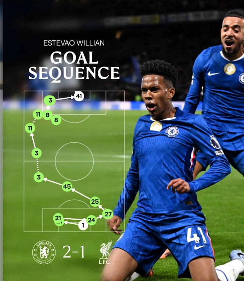 ในจังหวะนั้น มาร์ก กูกูเรย่า และ เอ็นโซ่ เฟร์นานเดซ ประสานงานในกรอบเขตโทษด้านซ้ายทำให้เกิดโอกาสในการเปิดบอลที่ เอสเตเวา สอดมาได้ก่อน แอนดี้ โรเบิร์ตสัน