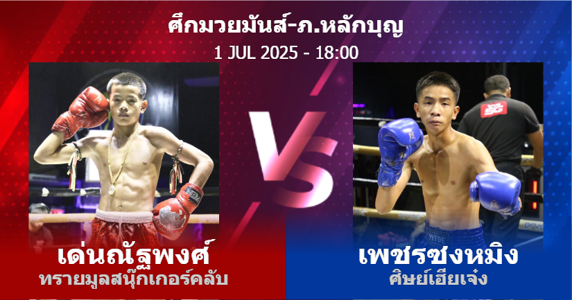 01/07/2568 18:00 น. ศึกมวยมันส์-ภ.หลักบุญ เด่นณัฐพงศ์ ทรายมูลสนุ๊กเกอร์คลับ เพชรซงหมิง ศิษย์เฮียเจ๋ง