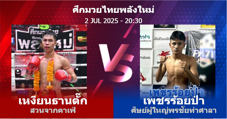 02/07/2025 20:30 ศึกมวยไทยพลังใหม่ ช่วงที่ 2 เหงียนธานดั๊ก สวนจากคาเฟ่ เพชรร้อยป่า ศิษย์ผู้ใหญ่พรชัยท่าศาลา