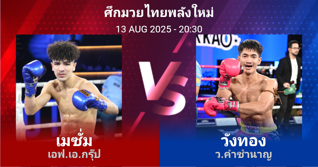 13/08/2025 20:30 ศึกมวยไทยพลังใหม่ ช่วงที่ 2 เมซั่ม เอฟ.เอ.กรุ๊ป วังทอง ว.คำชำนาญ