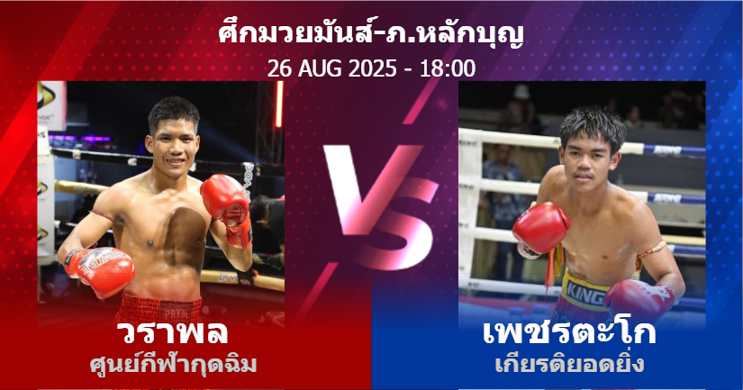 26/08/2025 18:00 ศึกมวยมันส์สนั่นเมือง วราพล ศูนย์กีฬากุดฉิม เพชรตะโก เกียรติยอดยิ่ง