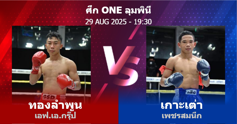 29/08/2025 19:30 ศึกวันแชมเปียนชิพลุมพินีมวยไทย 122 ป. ทองลำพูน เอฟ.เอ.กรุ๊ป เกาะเต่า เพชรสมนึก