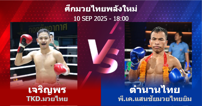 10/09/2025 18:00 ศึกมวยไทยพลังใหม่ เจริญพร TKD.มวยไทย ตำนานไทย พี.เค.แสนชัยมวยไทยยิม