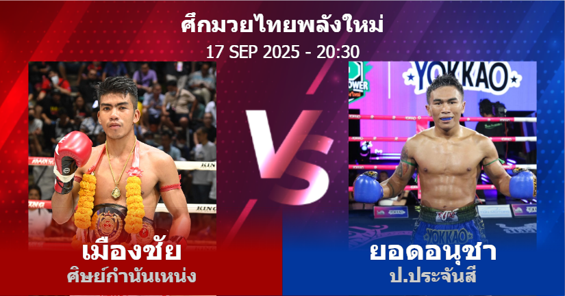 17/09/2025 20:30 ศึกมวยไทยพลังใหม่ ช่วงที่ 2 เมืองชัย ศิษย์กำนันเหน่ง ยอดอนุชา ป.ประจันสี