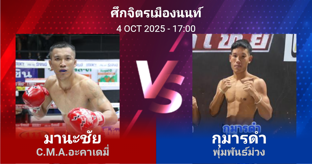 04/10/2025 17:00 ศึกจิตรเมืองนนท์ มานะชัย C.M.A.อะคาเดมี่ กุมารดำ พุ่มพันธ์ม่วง