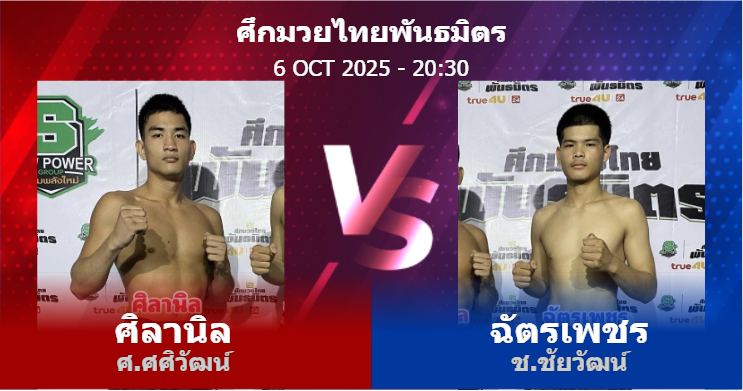 06/10/2025 20:30 ศึกมวยไทยพันธมิตร ช่วงที่ 2 ศิลานิล ศ.ศศิวัฒน์ ฉัตรเพชร ช.ชัยวัฒน์