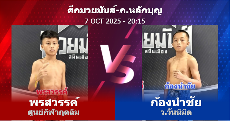 07/10/2025 20:15 ศึกมวยมันส์สนั่นเมือง ช่วงที่ 2 พรสวรรค์ ศูนย์กีฬากุดฉิม ก้องนำชัย ว.วันนิมิต