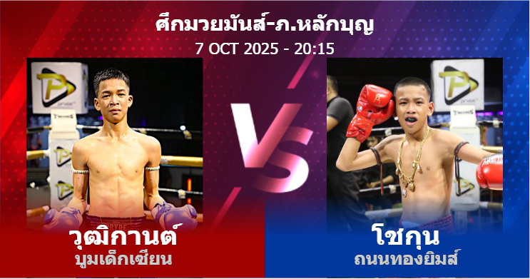 07/10/2025 20:15 ศึกมวยมันส์สนั่นเมือง ช่วงที่ 2 วุฒิกานต์ บูมเด็กเซียน โชกุน ถนนทองยิมส์