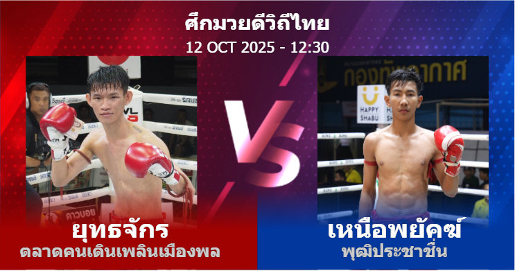 12/10/2025 12:00 ศึกมวยดีวิถีไทยชิงแชมป์ 100 ป. ยุทธจักร ตลาดคนเดินเพลินเมืองพล เหนือพยัคฆ์ พุฒิประชาชื่น