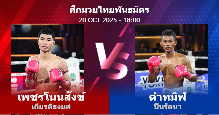 20/10/2025 18:00 ศึกมวยไทยพันธมิตร เพชรโนนสังข์ เกียรติธงยศ ดำทมิฬ ปืนรัตนา