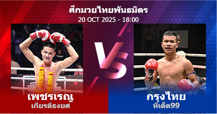 20/10/2025 18:00 ศึกมวยไทยพันธมิตร เพชรเรณู เกียรติธงยศ กรุงไทย ทีเด็ด99