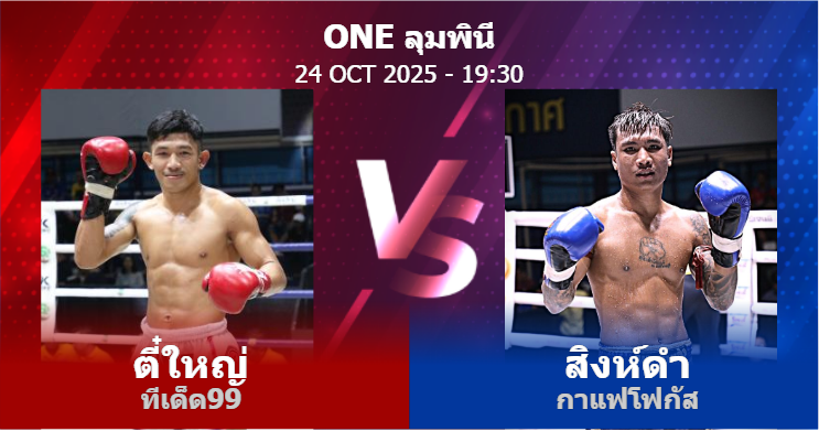 24/10/2025 19:30 ศึกวันแชมเปียนชิพลุมพินีมวยไทย รุ่นสตรอว์เวต ตี๋ใหญ่ ทีเด็ด99 สิงห์ดำ กาแฟโฟกัส