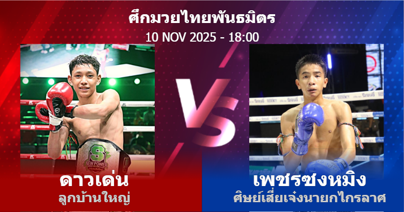 10/11/2025 18:00 ศึกมวยไทยพันธมิตร ดาวเด่น ลูกบ้านใหญ่ เพชรซงหมิง ศิษย์เสี่ยเจ๋งนายกไกรลาศ
