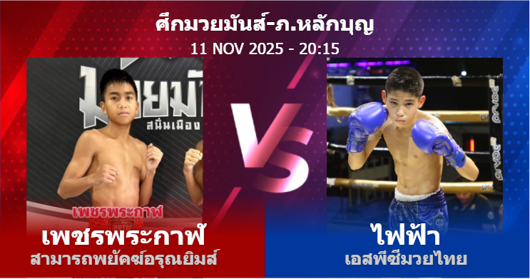 11/11/2025 20:15 ศึกมวยมันส์สนั่นเมือง ช่วงที่ 2 เพชรพระกาฬ สามารถพยัคฆ์อรุณยิมส์ ไฟฟ้า เอสพีซีมวยไทย