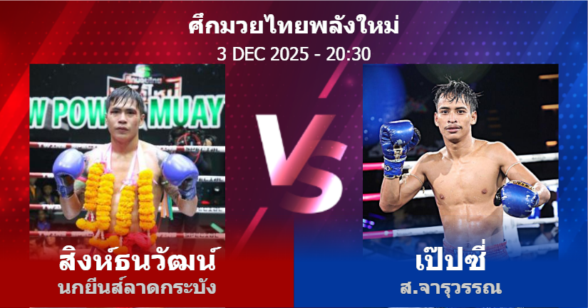 03/12/2025 20:30 ศึกมวยไทยพลังใหม่ ช่วงที่ 2 สิงห์ธนวัฒน์ นกยีนส์ลาดกระบัง เป๊ปซี่ ส.จารุวรรณ