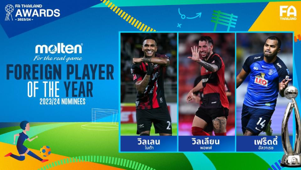 สมาคมกีฬาฟุตบอลแห่งประเทศไทยฯ เผยชื่อ 3 แคนดิเดต ประกอบไปด้วย วิลเล่น โมต้า, วิลเลียน พอพพ์ และ เฟร็ดดี้ อัลวาเรซ ในการลุ้นรางวัลนักฟุตบอลต่างชาติยอดเยี่ยมแห่งปี : MOLTEN FOREIGN PLAYER OF THE YEAR 2023/24
