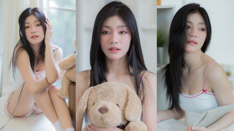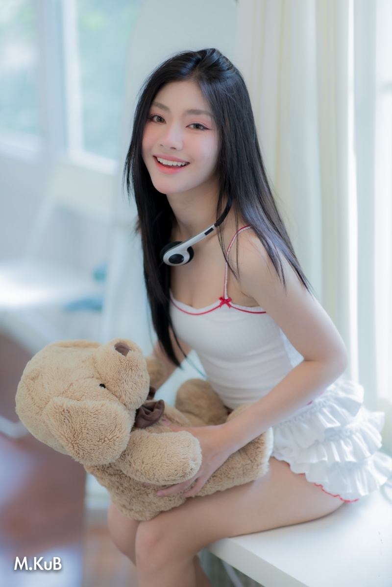 สาวตัวเล็กน่ารักกับโทนสีขาวสะอาดละมุนมาในชุดสายเดี่ยวสีขาว พร้อมตุ๊กตาหมีตัวไม่ใหญ่แต่น่ารักสุดขั้ว วาร์ป น้องพั้นช์ IG : parlunch_ เครดิตช่างภาพ FB : M.kub