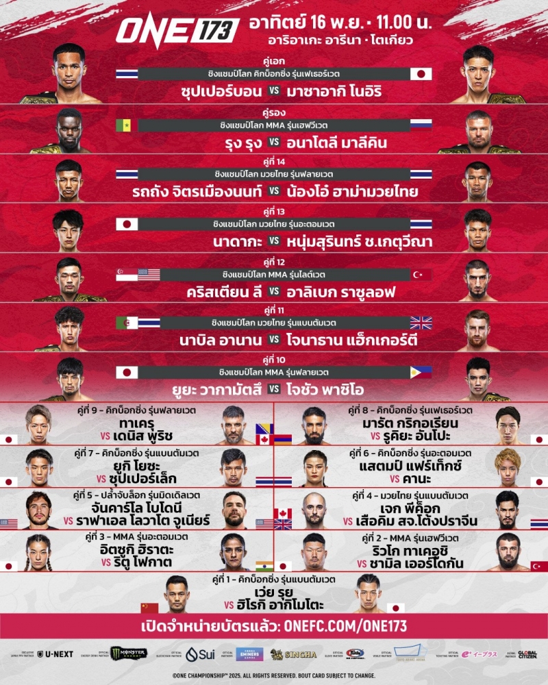 ศึก ONE 173 ยกขบวนนักกีฬาระดับซูเปอร์สตาร์มาดวลเดือดกันถึง 16 คู่ บนดินแดนซามูไร โดยมีเข็มขัดแชมป์โลก ONE เป็นเดิมพันมากถึง 7 เส้นในอีเวนต์เดียว โดยจะถ่ายทอดสดจากสังเวียน อาริอาเกะ อารีนา กรุงโตเกียว ในวันอาทิตย์ที่ 16 พ.ย.นี้ เริ่มคู่แรกเวลา 11.00 น.