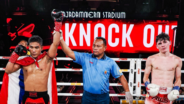 ชายหล้า ภ.หลักบุญ โชว์หมัดเด็ด น็อก โอเว่น จีลิส นักชกอังกฤษ ยก 2 ในมวยคู่เอก RWS ที่เวทีมวยราชดำเนิน เมื่อ 18 ตุลาคมที่ผ่านมา