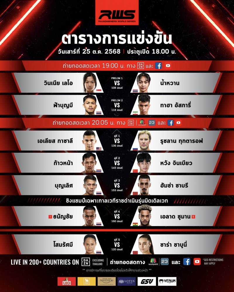 ศึก RWS คืนวันเสาร์ที่ 25 ตุลาคมนี้ จึงเป็นอีกหนึ่งสังเวียนที่จะระเบิดความมันส์ สั่นสะเทือนเวทีอย่างแน่นอน แฟนมวยไทยห้ามพลาดชมเด็ดขาด! ถ่ายทอดสดตรงจากเวทีราชดำเนิน ทางช่อง Workpoint 23 ตั้งแต่เวลา 20:15 น. เป็นต้นไป! เตรียมเสียงเชียร์ของคุณให้พร้อม แล้วมาลุ้นระทึกไปพร้อมกัน!