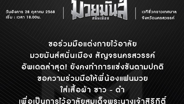 ศึกมวยมันส์สนั่นเมือง นัดสัญจรนครสวรรค์ ทำการแข่งขัน ตามปกติ แต่ขอความร่วมมือแฟนมวยแต่งกายไว้อาลัย