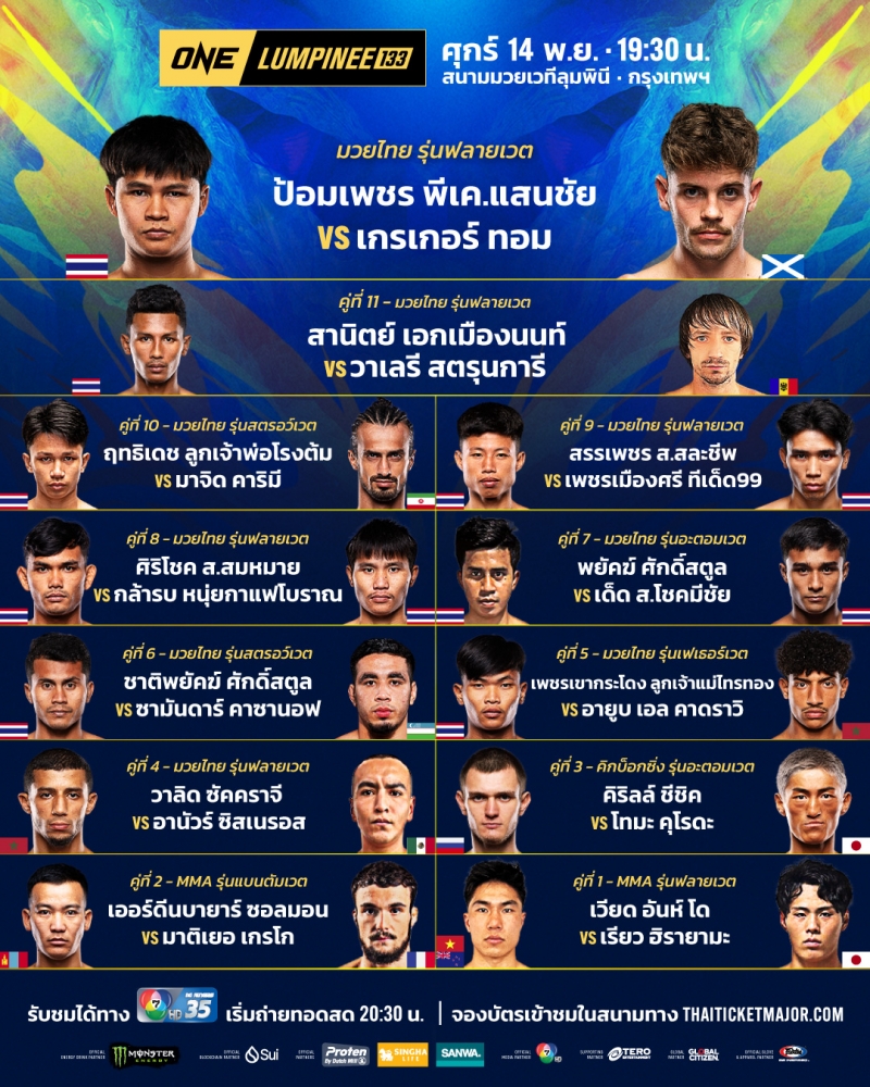 โปรแกรมการแข่งขันทุกคู่ศึก ONE ลุมพินี 133