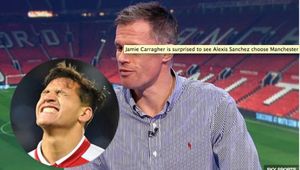 เจมี่ คาร์ราเกอร์ ตำนานปราการหลังลิเวอร์พูล เสนอมุมมองที่น่าสนใจเกี่ยวกับการย้ายทีมของ อเล็กซิส ซานเชซ ตัวรุกอาร์เซนอล ที่มีโอกาสร่วมทีมแมนเชสเตอร์ ซิตี้ แต่กับเปลี่ยใจไปที่แมนเชสเตอร์ ยูไนเต็ด