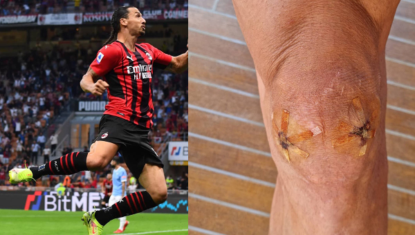 ซลาตัน อิบราฮิโมวิช หัวหอกจอมเก๋าของ เอซี มิลาน โชว์รอยแผลจากการผ่าหัวเข่า 3 เดือนที่แล้ว ก่อนคัมแบ็กลงเล่นอีกครั้งและยิงประตูได้ทันที