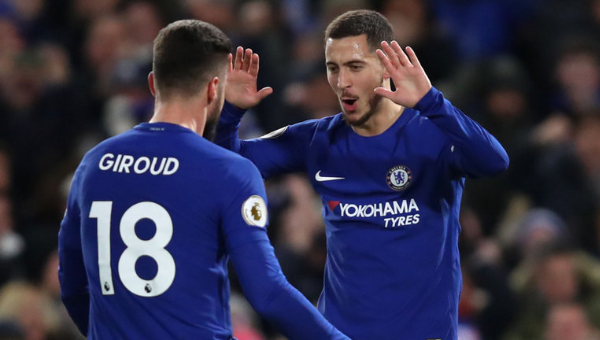 เอแดน อาซาร์ จอมทัพ เชลซี ยกนิ้วให้เพื่อนร่วมทีมใหม่ โอลิวิเย่ร์ ชีรูด์ ที่เพิ่งย้ายมาจาก อาร์เซน่อล และลงประสานงานร่วมกันได้ดีในเกมชนะ เวสต์บรอมวิช 3-0