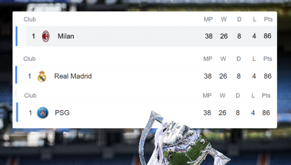 บังเอิญสุดๆ! เอซี มิลาน, ปารีส แซงต์-แชร์กแมง และ เรอัล มาดริด มีผลงานและคะแนนที่ทำให้คว้าแชมป์ลีกฤดูกาลล่าสุด เท่ากันทั้งสามทีม