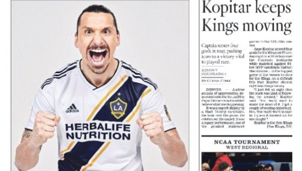 ซลาตัน อิบราฮิโมวิช กองหน้าตัวเก๋าชาวสวีเดน โชว์ความเหนือชั้นด้วยการซื้อโฆษณาเต็มหน้า เพื่อประกาศว่ากำลังจะเดินทางไป ลอส แองเจลิส
