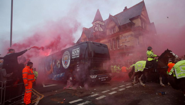 แฟนบอล ลิเวอร์พูล ข่มขวัญคู่แข่งตั้งแต่ก่อนลงสนามหลังจากต้อนรับรถบัสขนทัพนักเตะ แมนเชสเตอร์ ซิตี้ แบบจัดหนัก