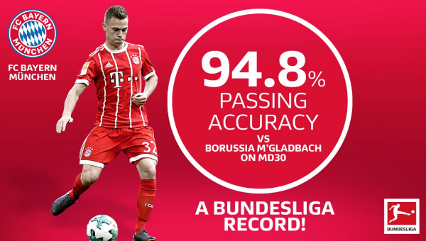 บาเยิร์น มิวนิค ตอกย้ำความเป็นยอดทีมด้วยการผ่านบอลสำเร็จสูงถึง 94.8 เปอร์เซ็นต์ ในเกมไล่อัด โบรุสเซีย มึนเช่นกลัดบัค 5-1 จนกลายเป็นสถิติใหม่ของบุนเดสลีกา เยอรมัน