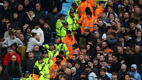 แฟนบอล แมนเชสเตอร์ ซิตี้ รายหนึ่ง ถูกเจ้าหน้าที่สนามนำตัวออกจากอัฒจันทร์ หลังจากทำท่าทางเครื่องบินเป็นการยั่วยุไปหาฝั่งแฟนบอล แมนเชสเตอร์ ยูไนเต็ด กลายเป็นภาพที่แพร่หลายอยู่ในโซเชียลมีเดีย
