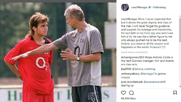เชส ฟาเบรกาส กองกลางเชลซีและหนึ่งในศิษย์เก่าของ อาร์แซน เวนเกอร์ ก็ออกมากล่าวยกย่องกุนซืออาร์เซน่อลว่าเป็นบุคคลที่มีบุญคุณและมอบคำสอนดีๆ มากมายให้เสมอมา