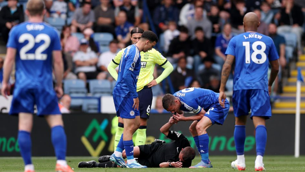 เจมี่ วาร์ดี้ ศูนย์หน้าเลสเตอร์ ซิตี้ เป่านกหวีดหยุดเกมชั่วคราว หลังเหตุการณ์ที่ผู้ตัดสิน เดวิด เว็บบ์ ได้รับบาดเจ็บ และต้องออกจากสนามหลังผ่านไปแค่ 22 นาที เกมกับเซาธ์แฮมป์ตัน