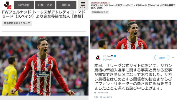 เจลีก ญี่ปุ่น ออกโรงยอมรับเป็นความผิดพลาดอย่างแรง หลังจากเว็บไซต์อย่างเป็นทางการตีข่าวว่า เฟร์นานโด ตอร์เรส กองหน้าตัวเก๋าชาวสเปน กำลังจะย้ายมาอยู่ ซางัน โทสึ