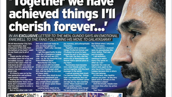 อิลคาย กุนโดอาน กองกลางมากประสบการณ์ที่กำลังจะย้ายจาก แมนฯ ซิตี้ ไปสู่ กาลาตาซาราย ซื้อหน้าหนังสือพิมพ์ท้องถิ่น แมนเชสเตอร์ อีฟวีนิงส์ นิวส์ เขียนจดหมายเปิดผนึกลาแฟนบอล ซิตี้เซ่นส์ สุดซาบซึ้ง