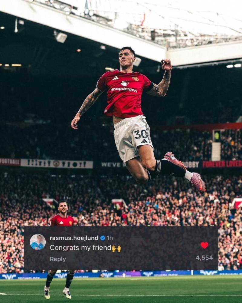 ราสมุส ฮอยลุนด์ ศูนย์หน้าชาวเดนมาร์ก ส่งข้อความแสดงความยินดีกับ เบนยามิน เชชโก้ ที่ทำประตูแรกในโอลด์ แทร็ฟฟอร์ด ช่วยให้แมนฯ ยูไนเต็ดชนะซันเดอร์แลนด์ 2-0 เมื่อวันเสาร์