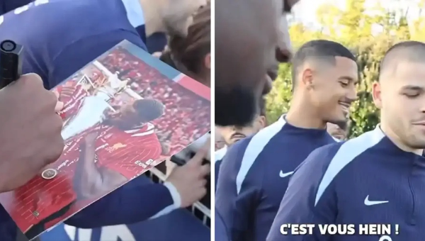Liverpool's Ibrahima Konaté (26) teases Arsenal's William Saliba (24) whilst signing a pic of him kissing the Premier League trophy: "Hey Wilo, it's yours this year."