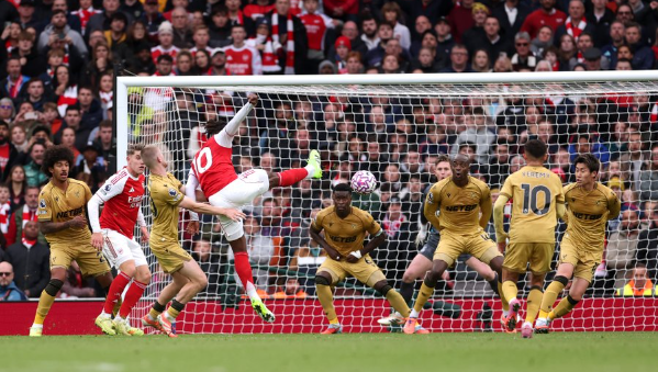 ครึ่งหลัง นาทีที่ 50 อาร์เซน่อล เกือบบวกสกอร์เพิ่มได้ เมื่อ ไรซ์ เปิดฟรีคิกไปให้ กาเบรียล มากัลเญส โหม่งชนคานอย่างน่าเสียดาย