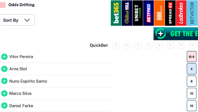 เรตอื่นๆที่น่าสนใจได้แก่เต็งสาม นูโน่ เอสปิริโต ซานโต บอส เวสต์แอม (8/1) และเต็งสี่ร่วมคือ ดาเนี่ยล ฟาร์เก้ เฮดโค้ช ลีดส์ กับ มาร์โค ซิลวา บอส ฟูแล่ม (10/1)