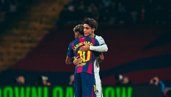 เอคตอร์ ฟอร์ต โอบกอดกับเพื่อนร่วมรุ่นอย่าง ลามีน ยามาล หลังการเผชิญหน้ากันครั้งแรกในสีเสื้อทีมอื่น