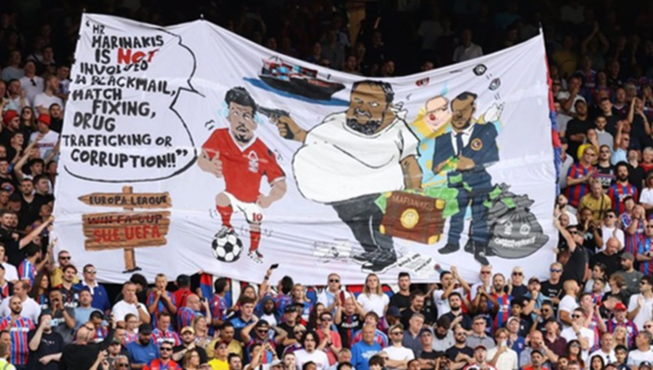 แบนเนอร์ หรือป้ายผ้าขนาดใหญ่ ถูกแฟนบอล คริสตัล พาเลซ นำเข้ามาโชว์บนอัฒจันทร์เกมพรีเมียร์ลีกที่เสมอ น็อตติงแฮม ฟอเรสต์ 1-1 ที่สนามเซลเฮิร์สท์ พาร์ค เมื่อเดือนสิงหาคม มีรูปภาพของ เอวานเจลอส มารินาคิส เจ้าของสโมสร ฟอเรสต์ ถือปืนจ่อหัว มอร์แกน กิ๊บบ์ส-ไวท์ ผู้เล่นของทีม